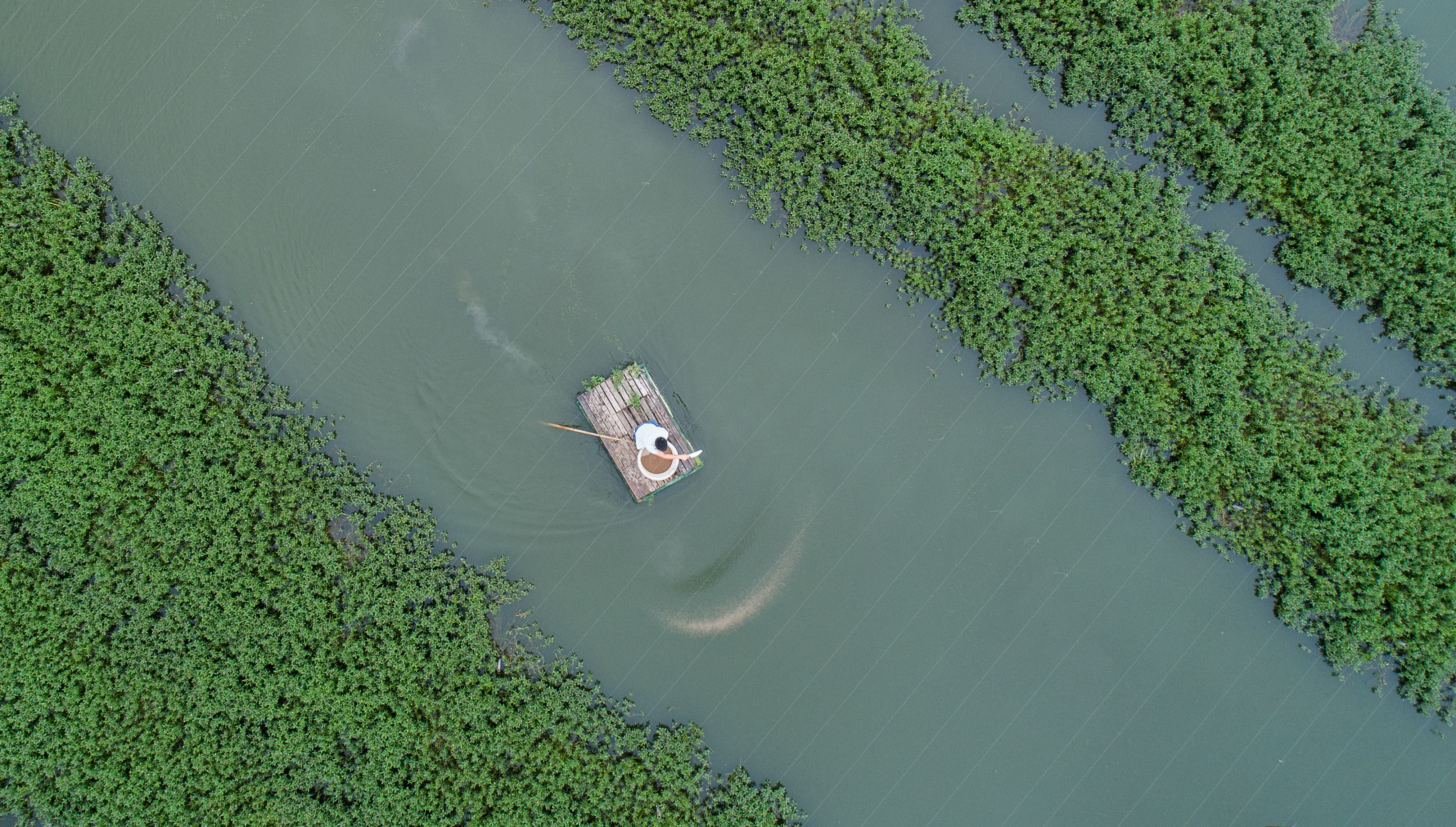 Aerial photo taken on Sept. 4, 2019 shows Shen Yunjie feeding crabs at an aquaculture cooperative in Zhili Township of Huzhou, east China's Zhejiang Province.(Xinhua/Xu Yu)