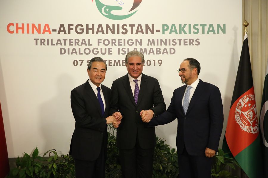 Chinese State Councilor and Foreign Minister Wang Yi (L), Afghan Foreign Minister Salahuddin Rabbani (R) and Pakistani Foreign Minister Shah Mehmood Qureshi attend the 3rd China-Afghanistan-Pakistan Foreign Ministers' Dialogue in Islamabad, Pakistan, Sept. 7, 2019. (Xinhua/Liu Tian)