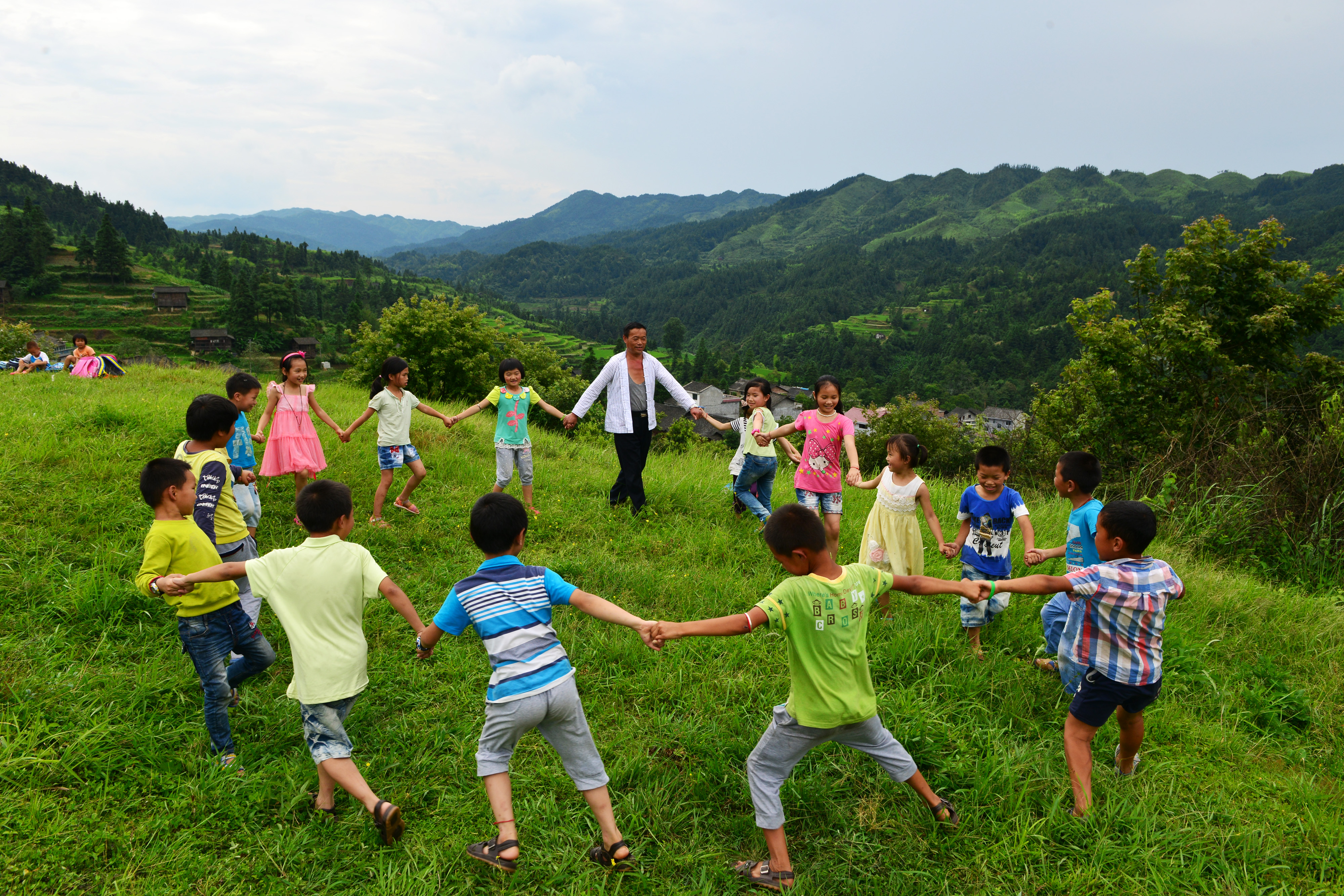 Jiang Tongying plays games with children on a grassland near Hua'ao primary school in Jianhe County of Qiandongnan Miao and Dong Autonomous Prefecture, southwest China's Guizhou Province, June. 29, 2016. (Xinhua/Yang Wenbin)