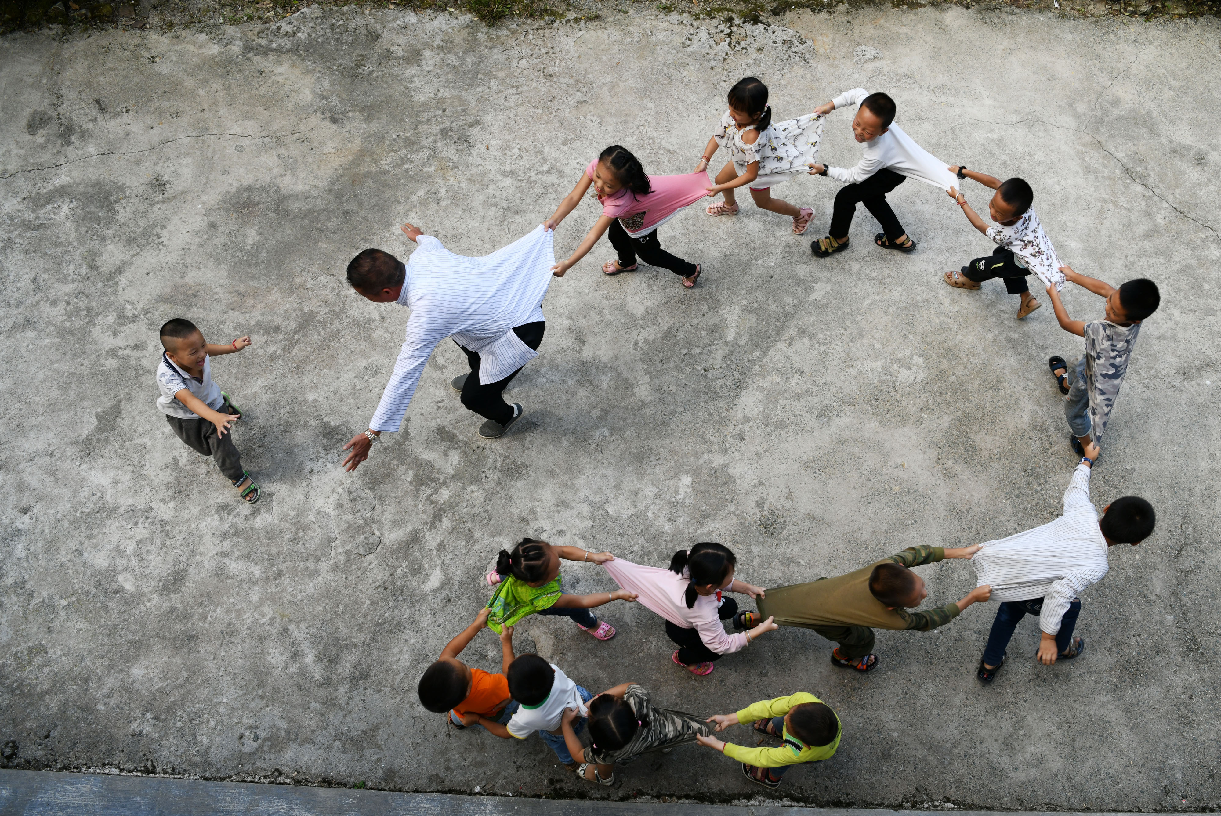 Jiang Tongying plays games with children at Hua'ao primary school in Jianhe County of Qiandongnan Miao and Dong Autonomous Prefecture, southwest China's Guizhou Province, Sept. 5, 2019. (Xinhua/Yang Wenbin)