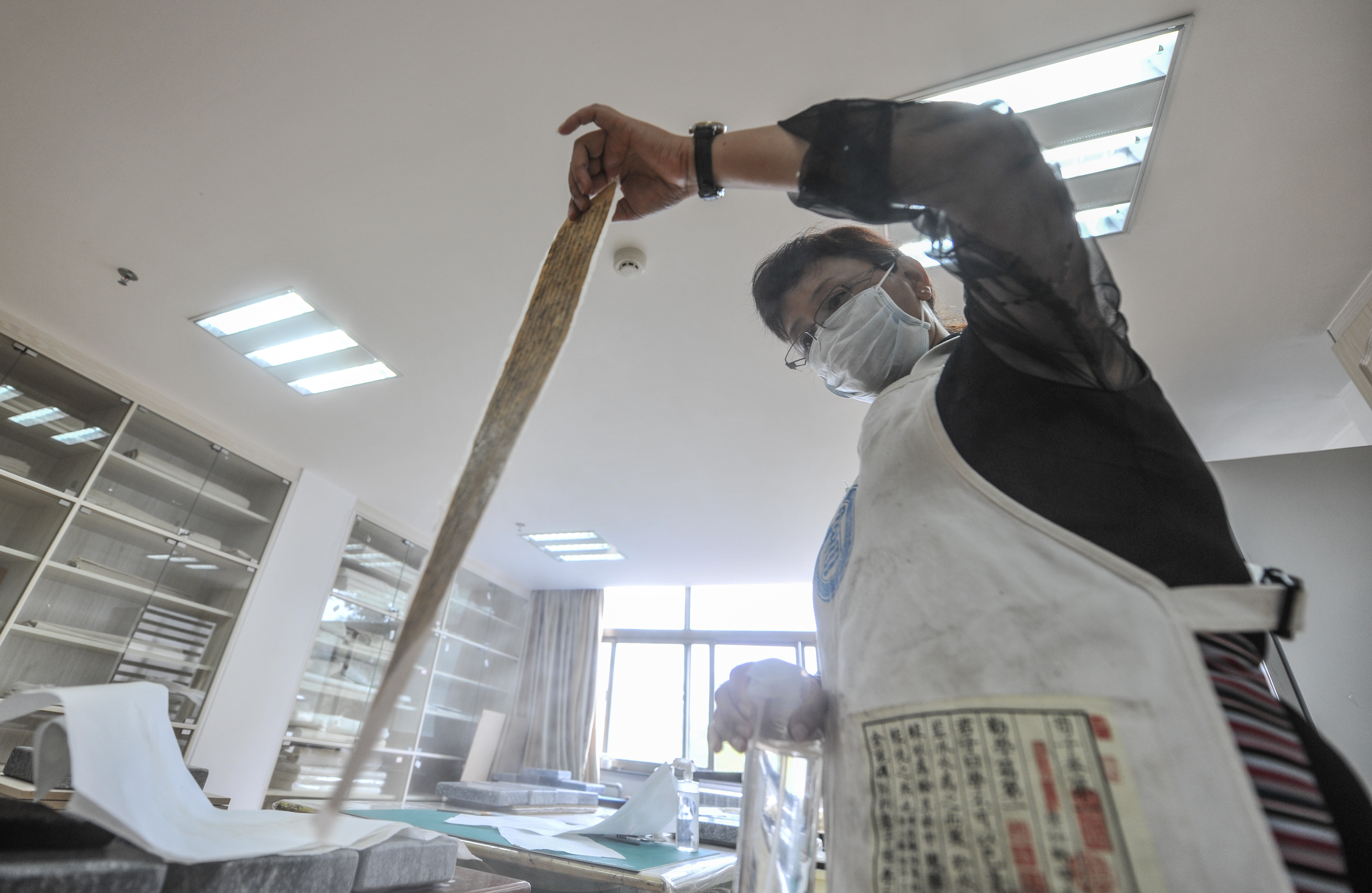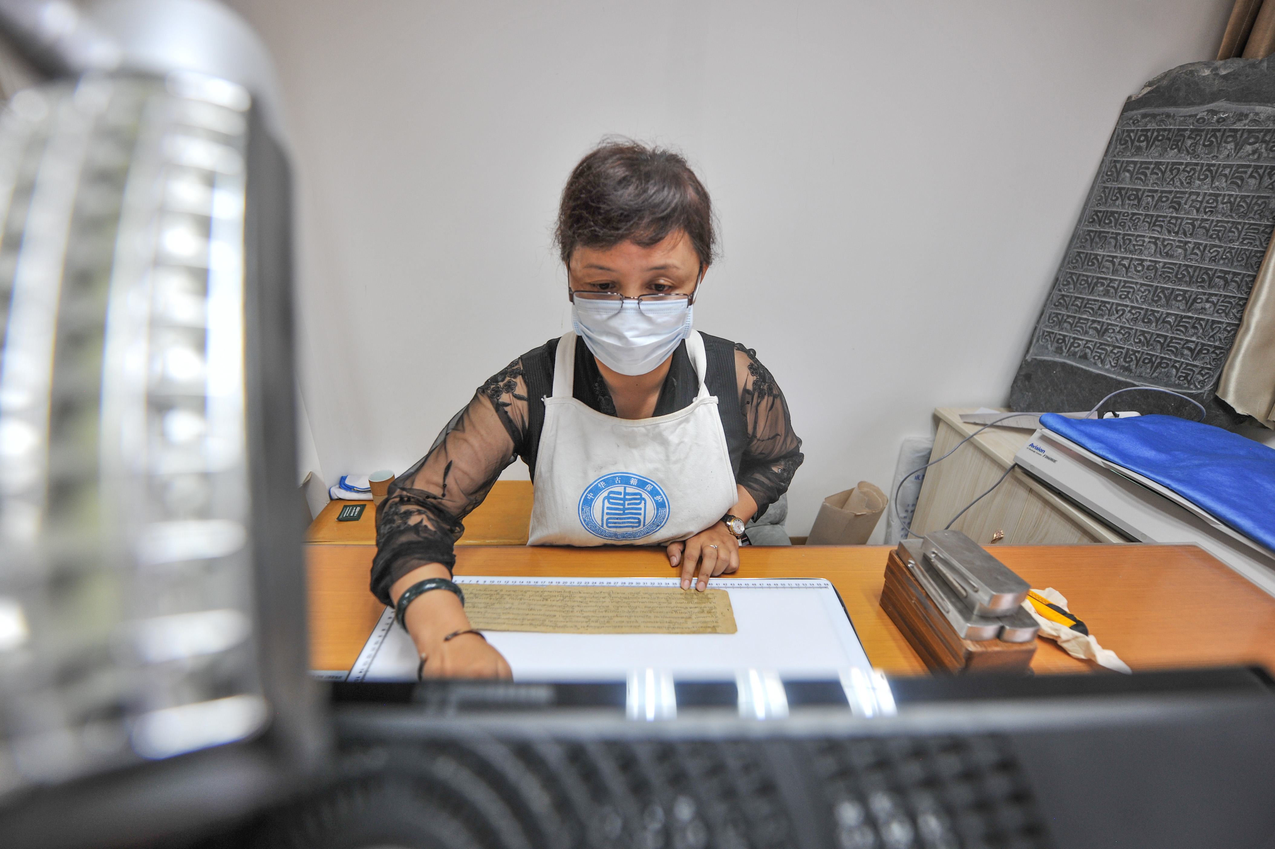 A staff member restores an ancient document at the ancient documents protection center of Tibet in Lhasa, southwest China's Tibet Autonomous Region, Sept. 12, 2019. (Xinhua/Jigme Dorje)