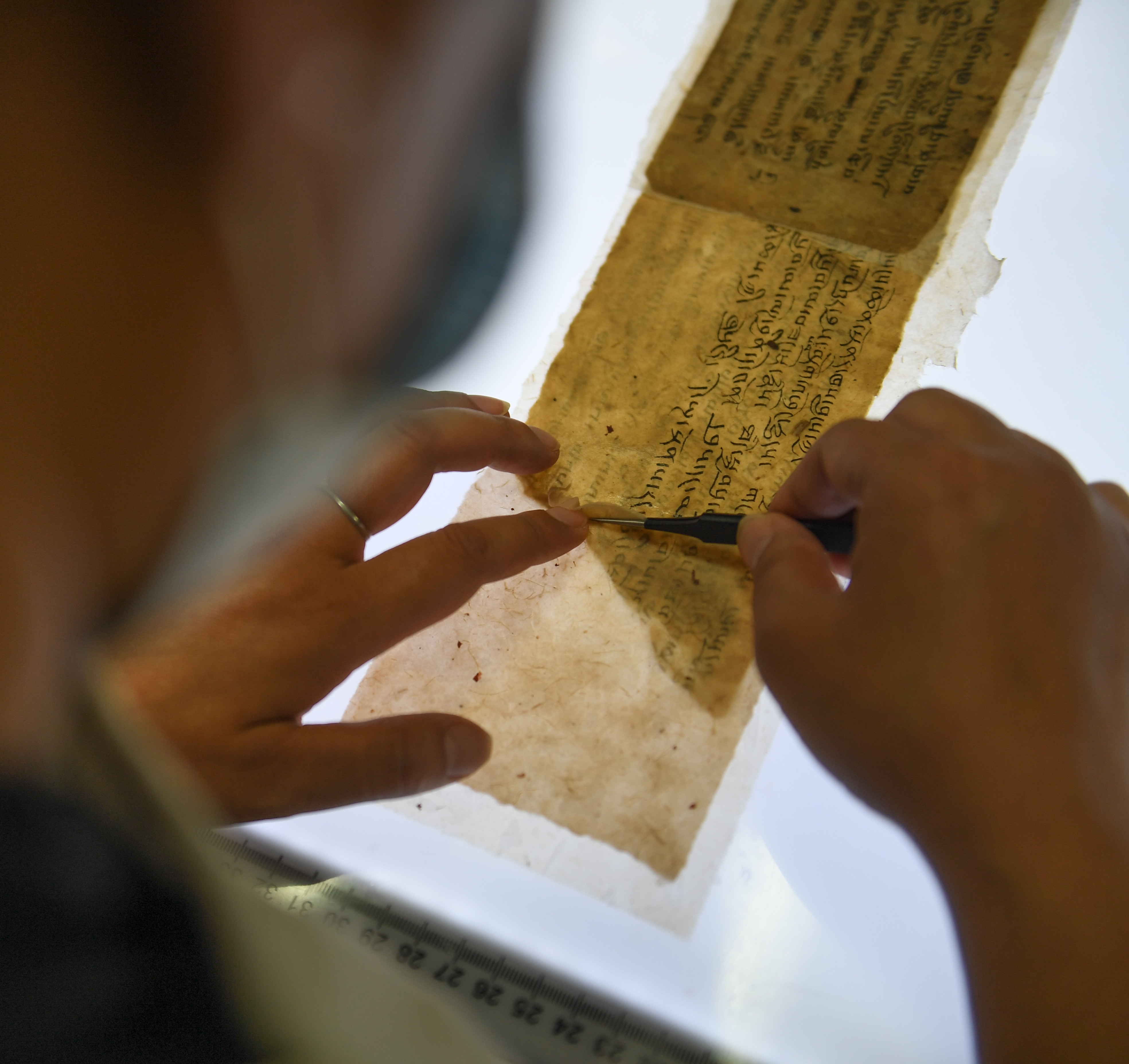 A staff member examines ancient documents with a history of more than 500 years at the ancient documents protection center of Tibet in Lhasa, southwest China's Tibet Autonomous Region, Sept. 12, 2019. (Xinhua/Jigme Dorje)