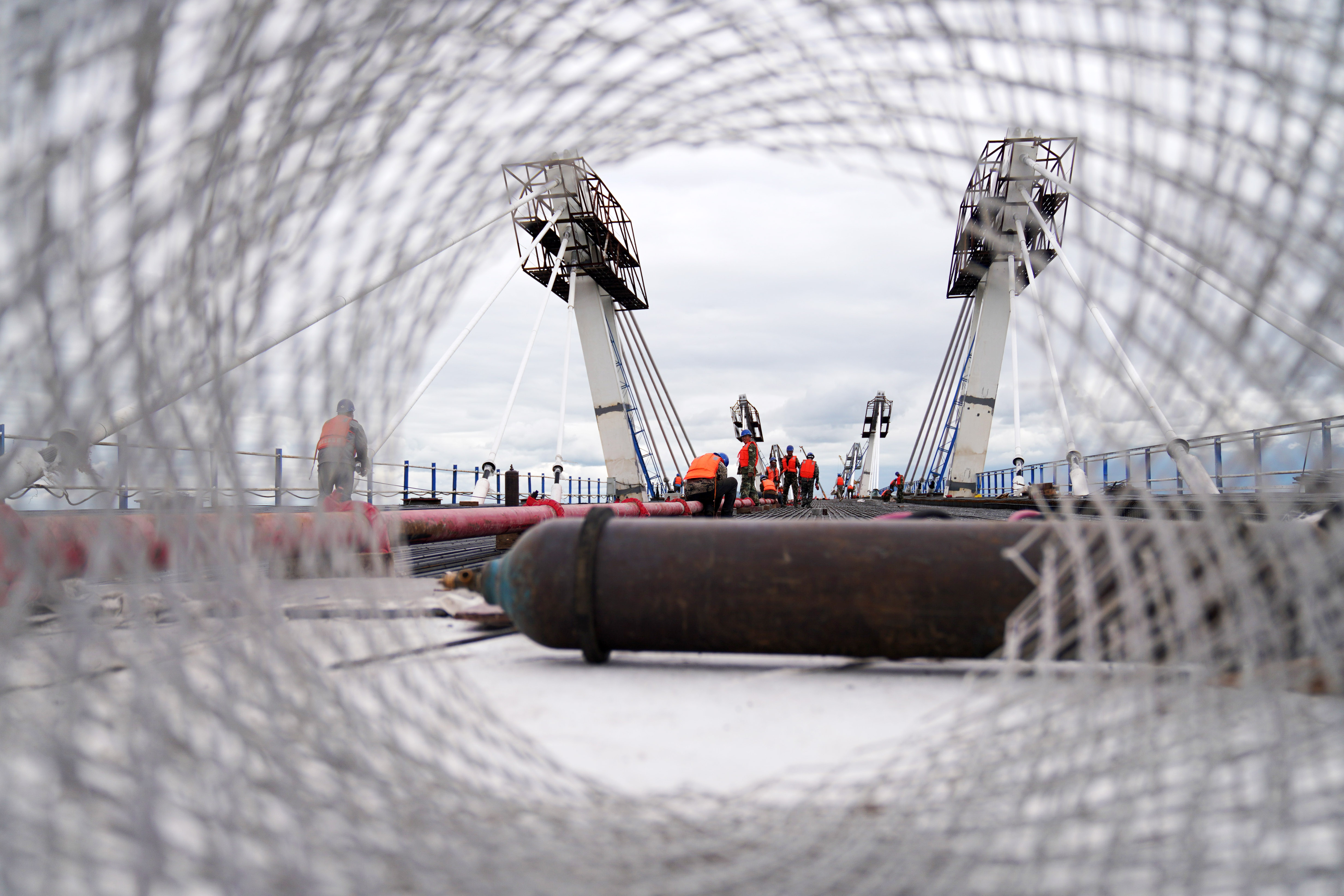 Workers are seen on the construction site of the Blagoveshchensk-Heihe highway bridge, which connects China and Russia across the Heilongjiang River, also known as the Amur River, Aug. 19, 2019. (Xinhua/Wang Jianwei)