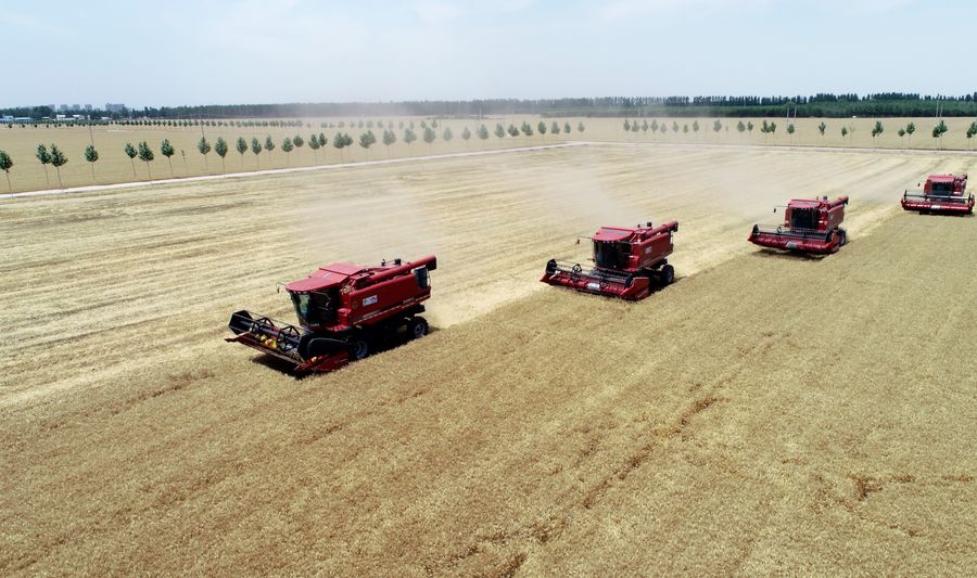 Reapers work at the wheat field in Yanli Village of Nanhe County, north China's Hebei Province, June 10, 2019. (Xinhua/Zhu Xudong)