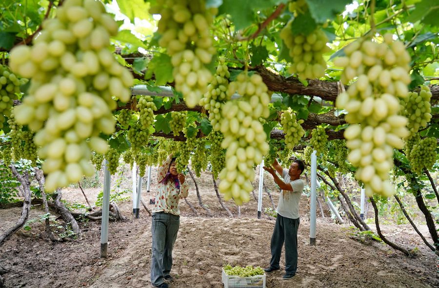 Farmers pick grapes in Haoyao Village of Sangyuan Township in Huailai County, north China's Hebei Province, Sept. 9, 2019. (Xinhua/Yang Shiyao)