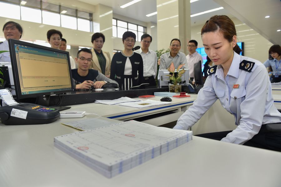 A tax official prepares a value-added tax (VAT) invoice of a real estate transaction in Fuzhou, capital of southeast China's Fujian Province, May 1, 2016. (Xinhua)