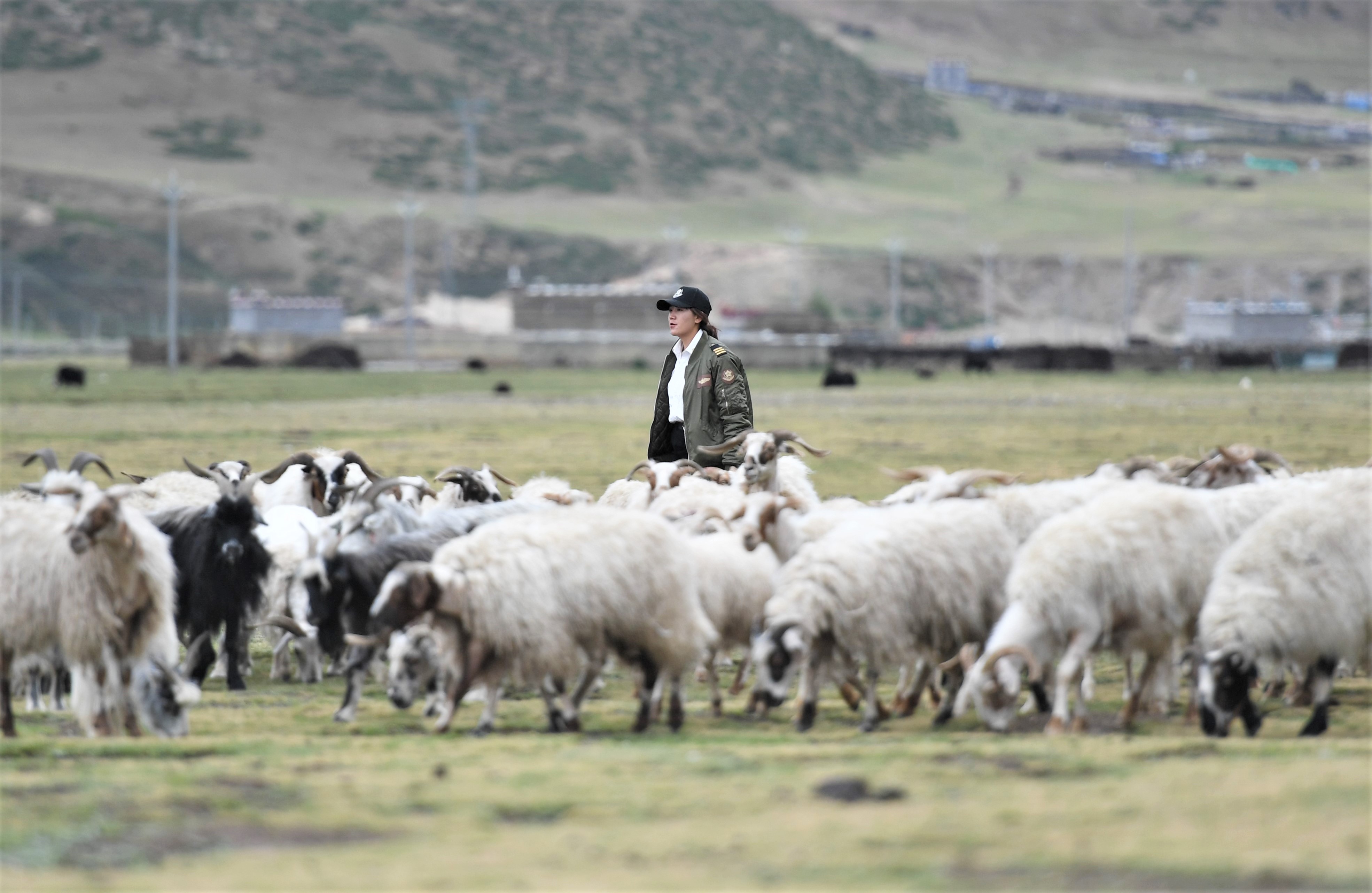 Jianre Yixi herds sheep in southwest China's Tibet Autonomous Region, July 13, 2019. (Xinhua/Purbu Zhaxi)