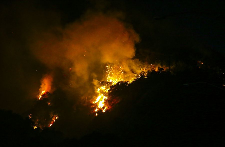 The U.S. National Weather Service issued red-flag warnings until 6:00 p.m. Pacific Time Saturday for Los Angeles and surrounding areas. Gusty offshore winds and very low humidity are increasing the risk of fires spreading.