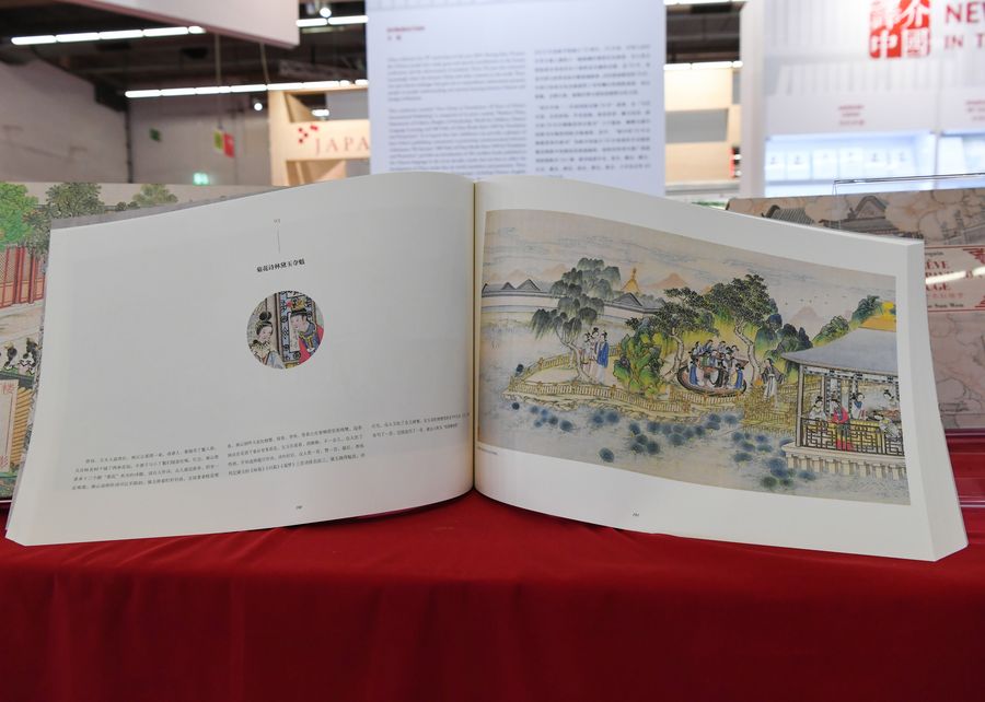 Photo taken on Oct. 17, 2019 shows an inner page of the Chinese limited edition of "Illustrated Classics of Chinese Literature: Dream of the Red Chamber by Sun Wen" at Frankfurt Book Fair in Frankfurt, Germany.(Xinhua/Lu Yang)