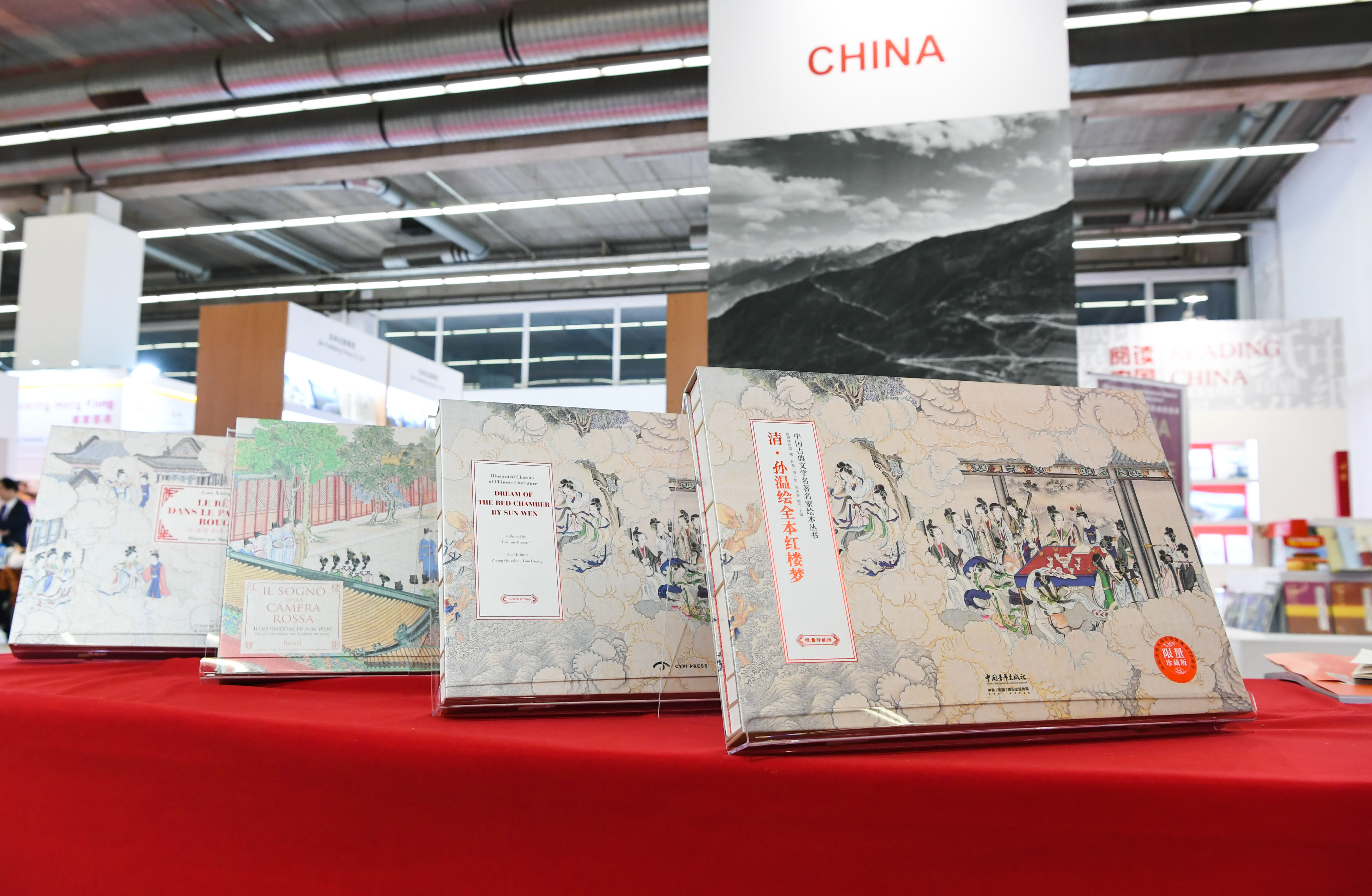Photo taken on Oct. 17, 2019 shows limited editions in Chinese, English, Italian and French (R to L) of "Illustrated Classics of Chinese Literature: Dream of the Red Chamber by Sun Wen" at Frankfurt Book Fair in Frankfurt, Germany. (Xinhua/Lu Yang)