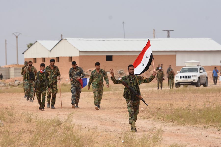 Syrian soldiers are seen inside the Tabqa airbase in the Tabqa city of Raqqa province in northern Syria on Oct. 16, 2019. (Str/Xinhua)