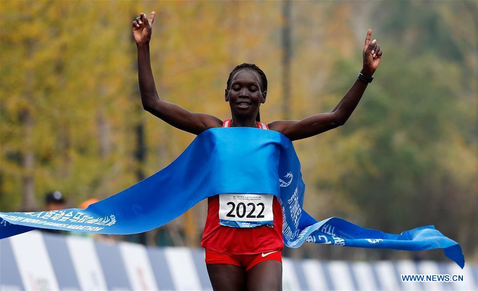 Eunice Chumba of Bahrain crosses the finishing line during the women's marathon individual final of track and field at the 7th CISM Military World Games in Wuhan, capital of central China's Hubei Province, Oct. 27, 2019. (Xinhua/Wang Lili)