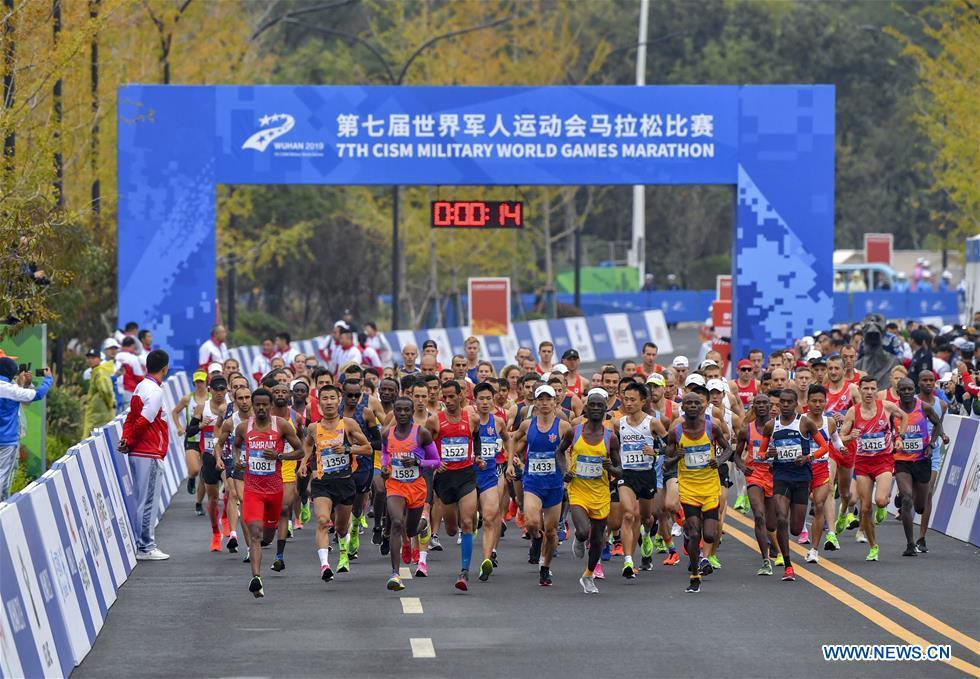 Athletes set off during the men's marathon individual final of track and field at the 7th CISM Military World Games in Wuhan, capital of central China's Hubei Province, Oct. 27, 2019. (Xinhua/Hu Huhu)