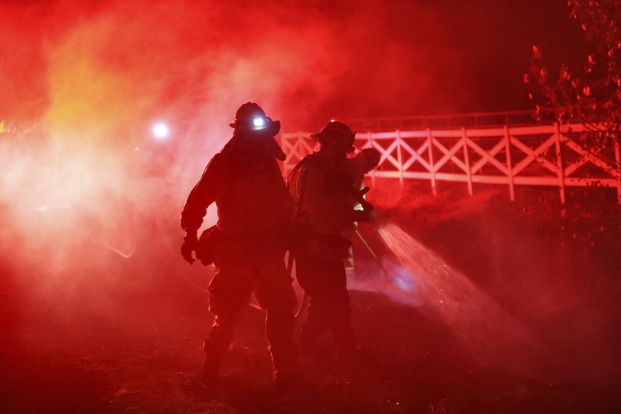 The state fire department said firefighters face steep terrain in remote areas, and will continue to mitigate structure threats and find opportunities to construct control lines.