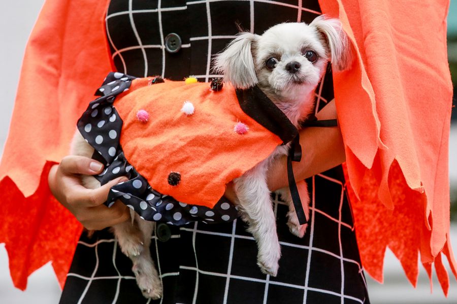 People carry their dogs which are dressed in Halloween costumes as they take part in the "Petrified" Halloween celebration in Quezon City, the Philippines, Oct. 27, 2019. (Xinhua/Rouelle Umali)