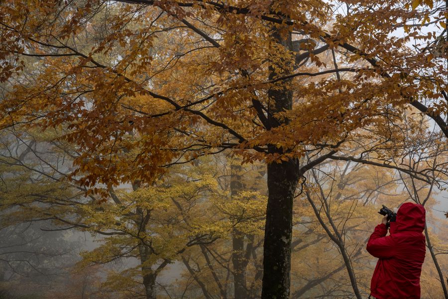 A tourist takes photos of autumn scenery at the Shennongjia National Park, central China's Hubei Province, Oct. 26, 2019. (Xinhua/Du Huaju)