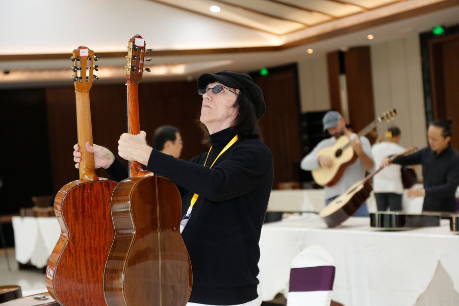 A foreign judge reviews candidate guitars during the guitar making competition in Zheng'an County in Zunyi City, southwest China's Guizhou Province on Oct. 27, 2019. (Photo provided to Xinhua)
