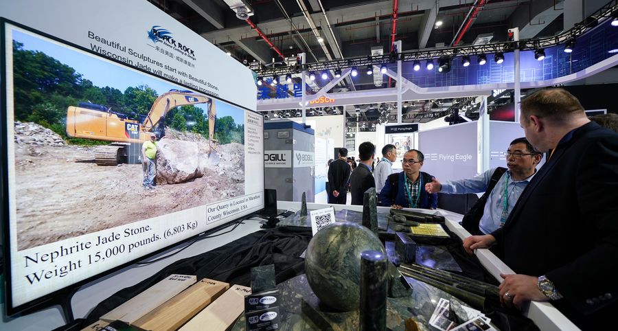 An exhibitor introduces Wisconsin jade to visitors at the first China International Import Expo in Shanghai, east China, Nov. 7, 2018. (Xinhua/Wang Jianhua)