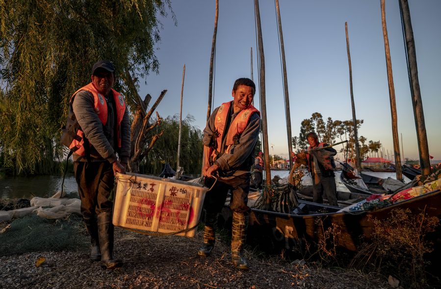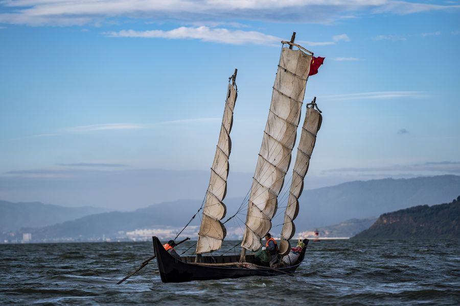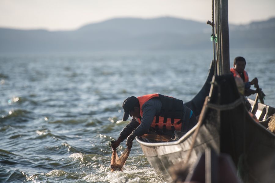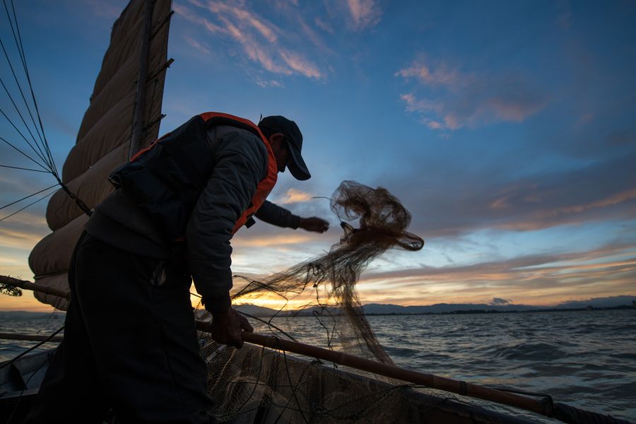 Fishermen catch fish on Dianchi Lake in Kunming, southwest China's Yunnan Province, Oct. 23, 2019. (Xinhua/Hu Chao)