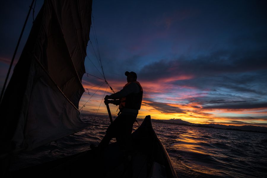 Fisherman Li Peiguang catches fish on Dianchi Lake in Kunming, southwest China's Yunnan Province, Oct. 22, 2019. (Xinhua/Hu Chao)