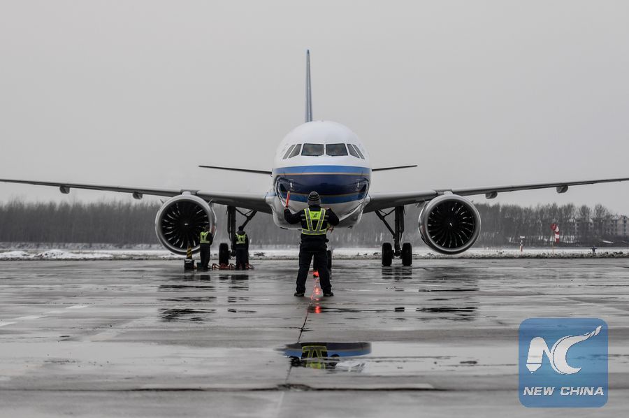 Un auxiliar guía un avión Airbus A320-neo para su estacionamiento en una pista, en Shenyang, capital de la provincia de Liaoning, en el noreste de China, el 16 de febrero de 2017. (Xinhua/Pan Yulong)
