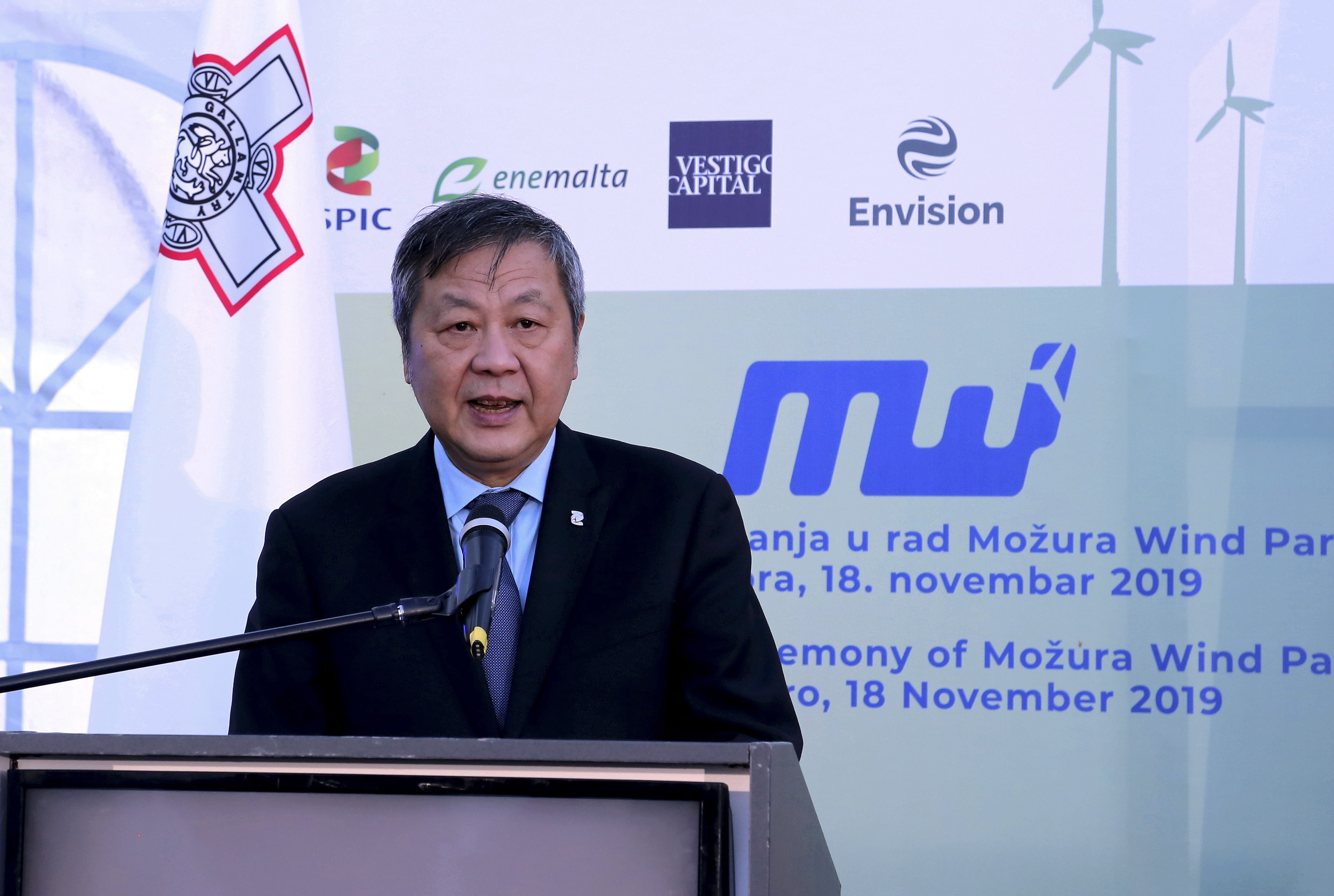Chairman of the China's Shanghai Electric Power Company (SEP) Wang Yundan gives a speech at the inauguration ceremony of the Mozura Wind Park in southern Montenegro on Nov. 18, 2019. (Xinhua/Shi Zhongyu)