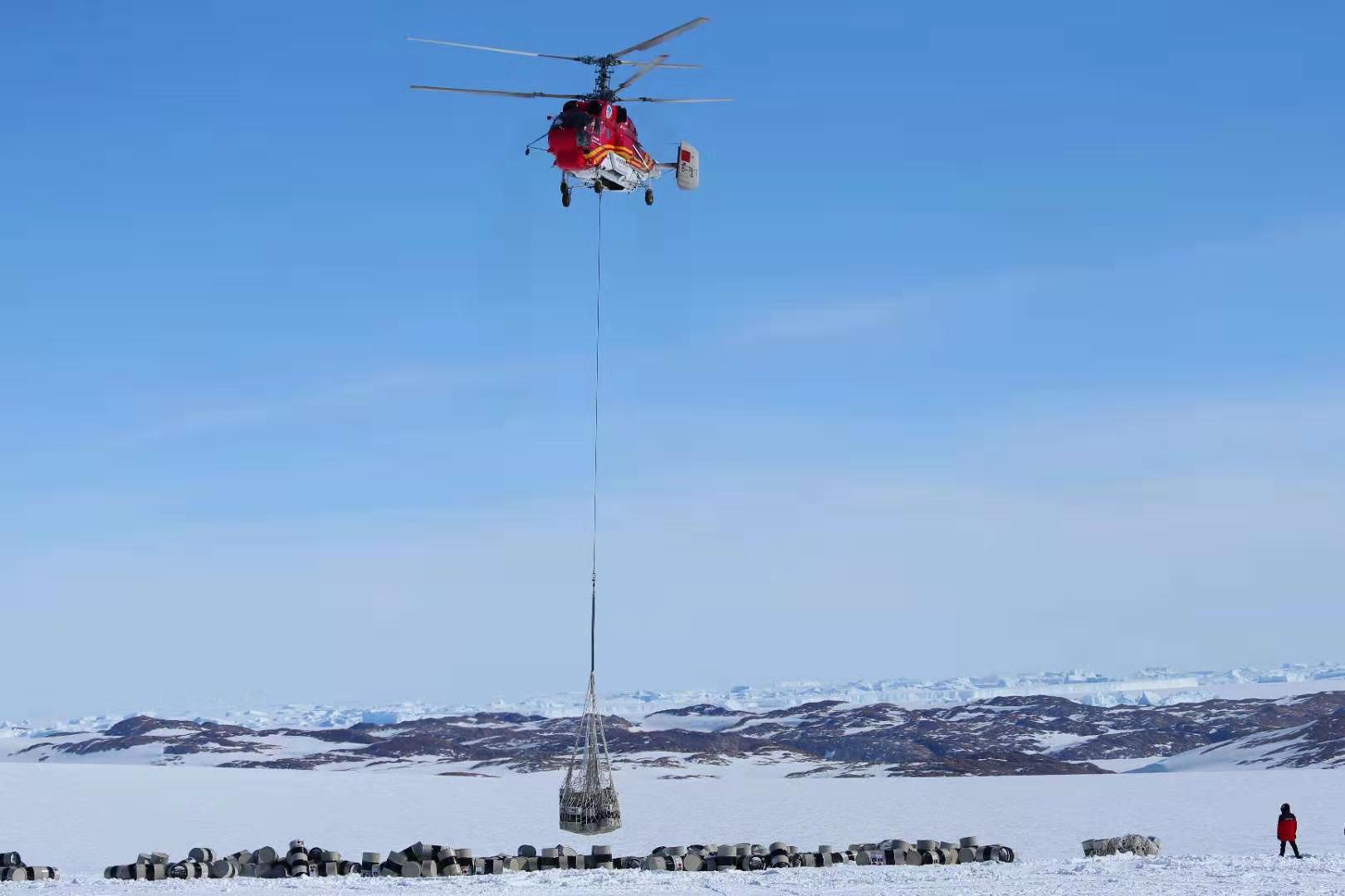 The helicopter unloads cargos from China's polar icebreaker Xuelong in the waters in Antarctica, Nov. 23, 2019. (Xinhua/Liu Shiping)