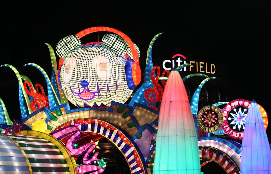 Illuminated lanterns are seen at the Hello Panda Festival at Citi Field baseball park in New York, the United States, on Dec. 6, 2019. (Xinhua/Qin Lang)