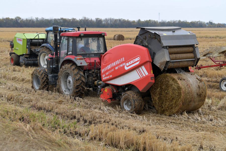 An agricultural vehicle packs up collected wheat straw in the field in Jiangxiang Town of Nanchang County, Nanchang, east China's Jiangxi Province, Nov. 29, 2019. (Xinhua/Peng Zhaozhi)