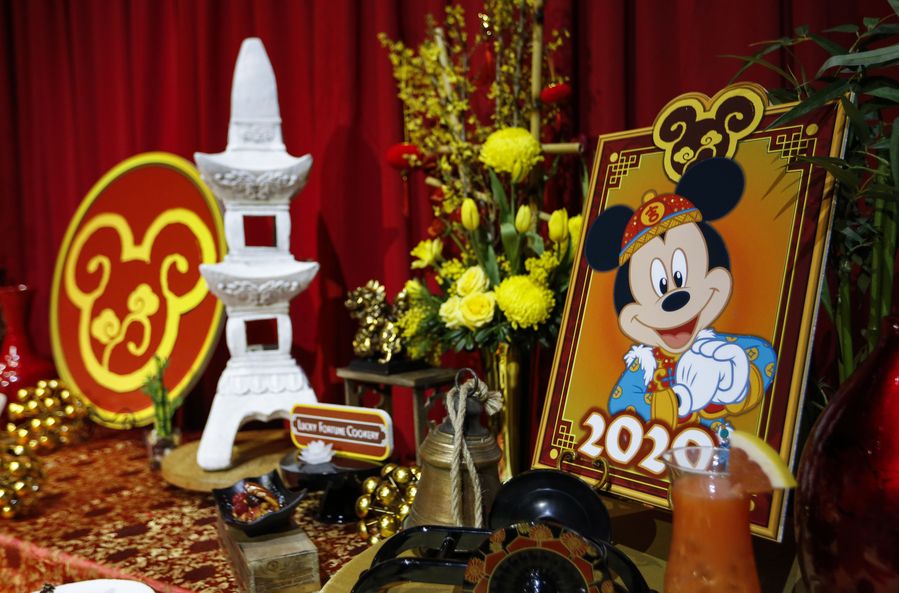 Chinese-style items featuring the images of Mickey Mouse are displayed during the Chinese Lunar New Year celebrations at Disney's California Adventure Park in Anaheim, the United States, Jan. 17, 2020. (Xinhua/Li Ying)
