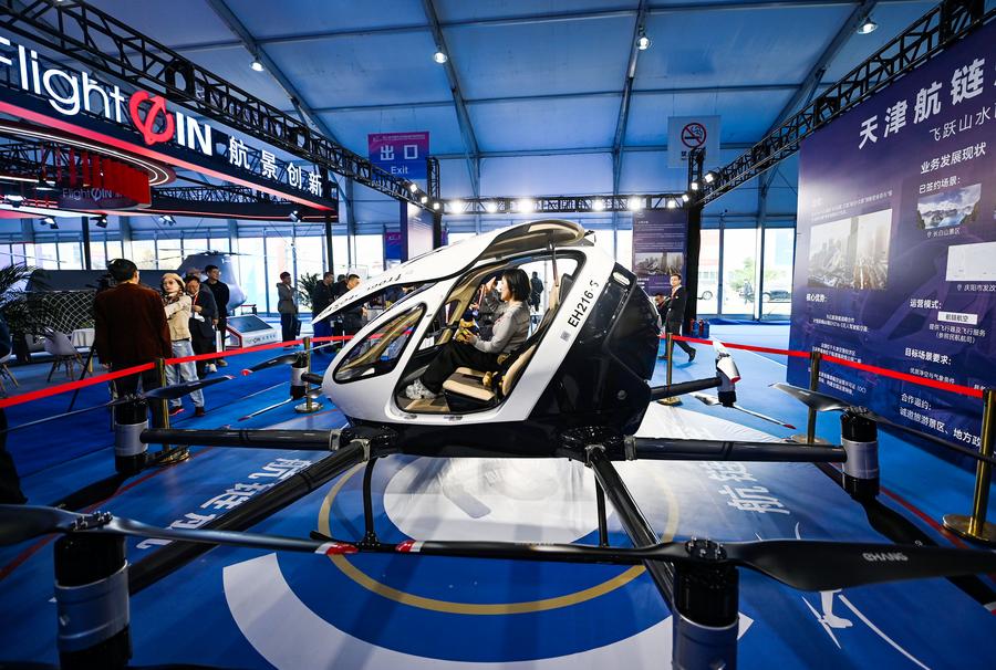 TIANJIN, Oct. 19 (Xinhua) -- The seventh China Helicopter Exposition, which concluded on Sunday in north China's Tianjin Municipality, featured a 5,000-square-meter pavilion dedicated to the low-altitude economy, attracting crowds with a striking orca-shaped eVTOL, an electric vertical take-off and landing aircraft developed in China.