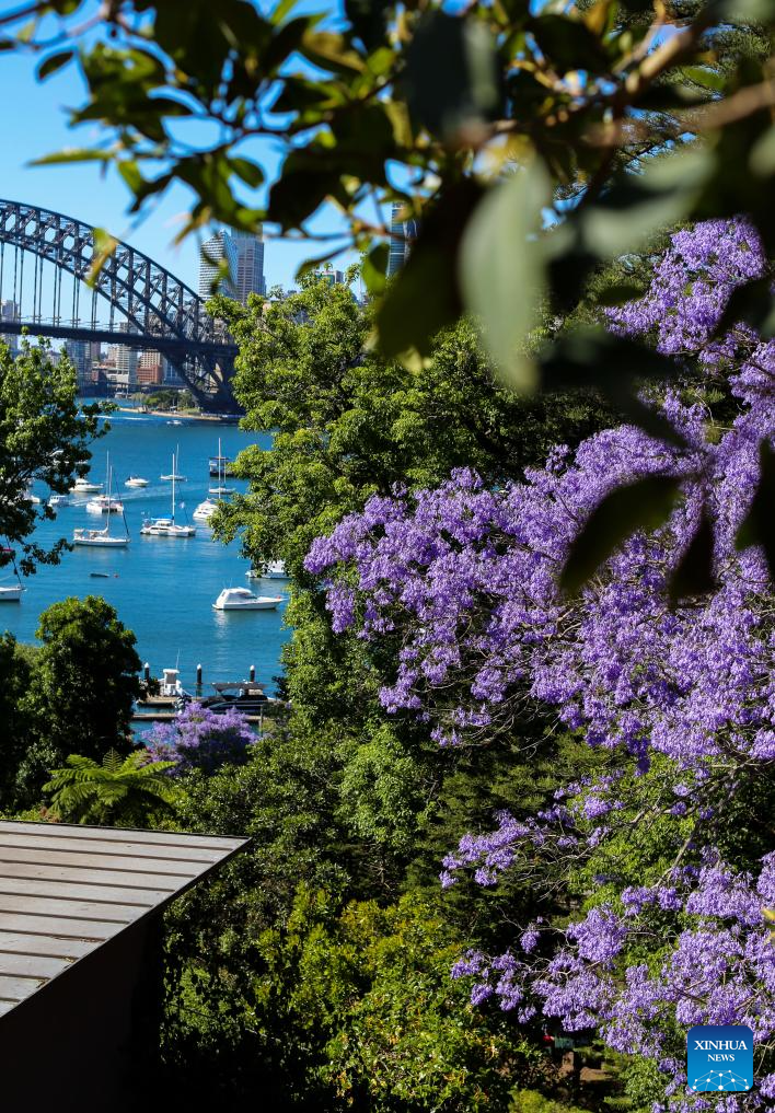 This photo taken on Nov. 5, 2025 shows the scenery of blooming jacaranda and Harbor Bridge in Sydney, Australia. (Xinhua/Ma Ping)