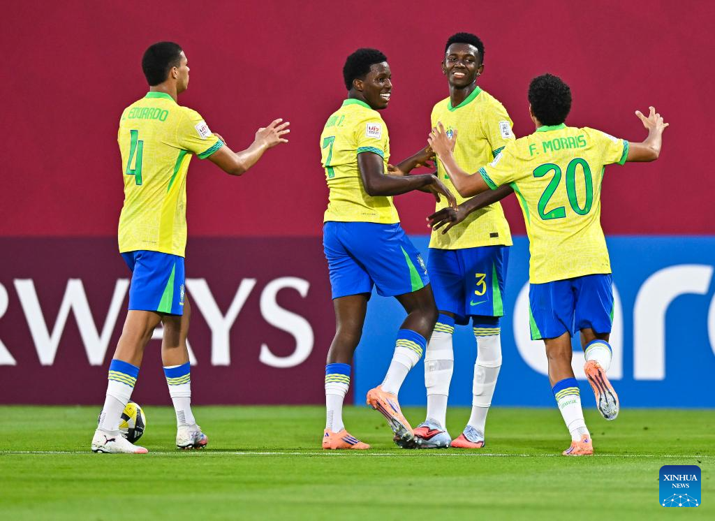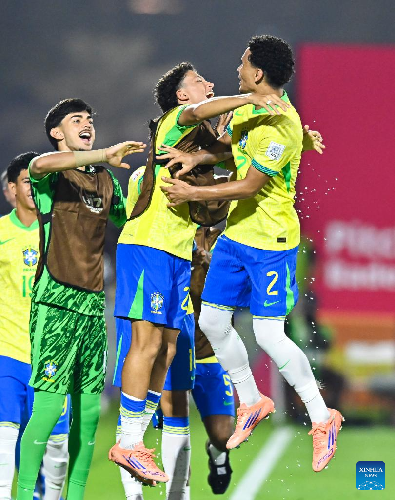 Vitor Hugo (2nd R) of Brazil celebrates with his teammates after scoring during the group H match between Brazil and Honduras of FIFA U17 World cup Qatar 2025 in Doha, Qatar, on Nov. 4, 2025. (Photo by Nikku/Xinhua)