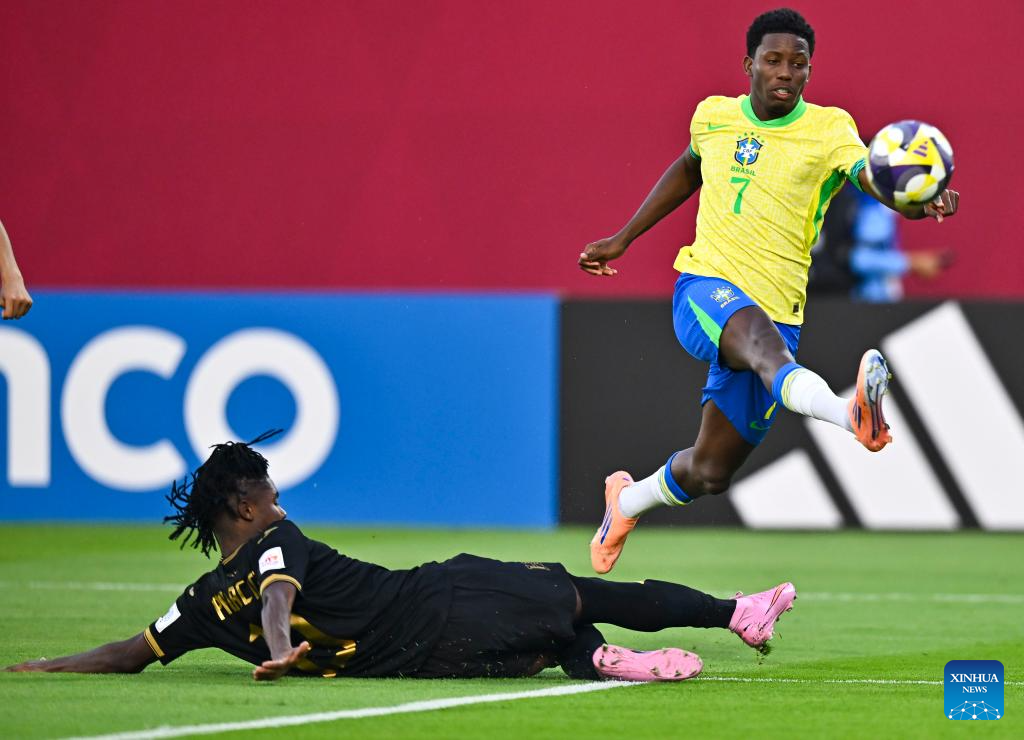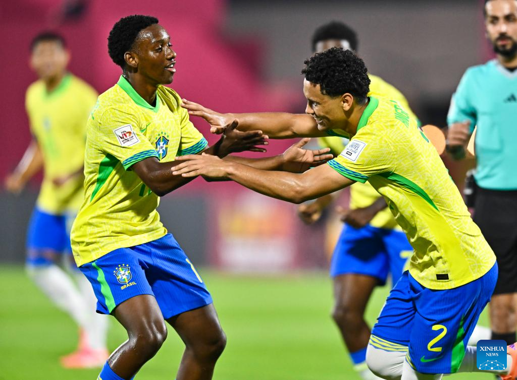 Angelo (R) of Brazil celebrates with his teammates after scoring during the group H match between Brazil and Honduras of FIFA U17 World cup Qatar 2025 in Doha, Qatar, on Nov. 4, 2025. (Photo by Nikku/Xinhua)