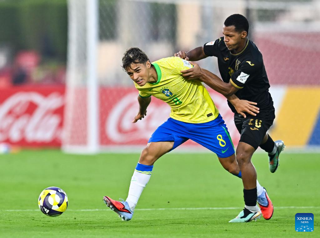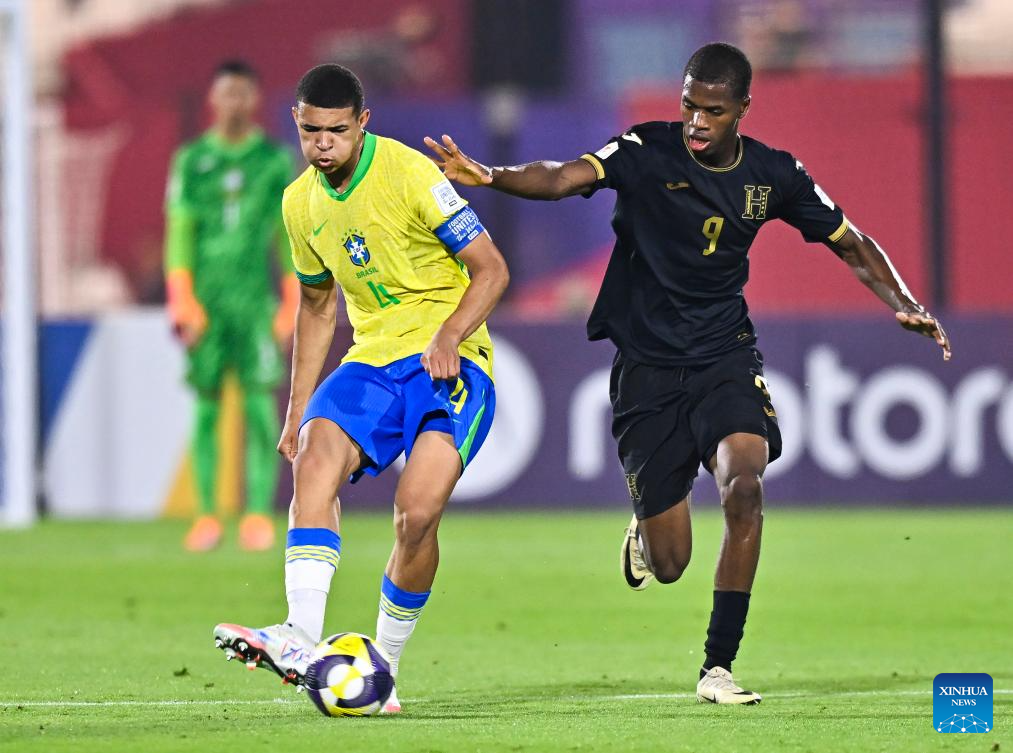 Tiago (L) of Brazil vies with Alexander Alvarez of Honduras during the group H match between Brazil and Honduras of FIFA U17 World cup Qatar 2025 in Doha, Qatar, on Nov. 4, 2025. (Photo by Nikku/Xinhua)