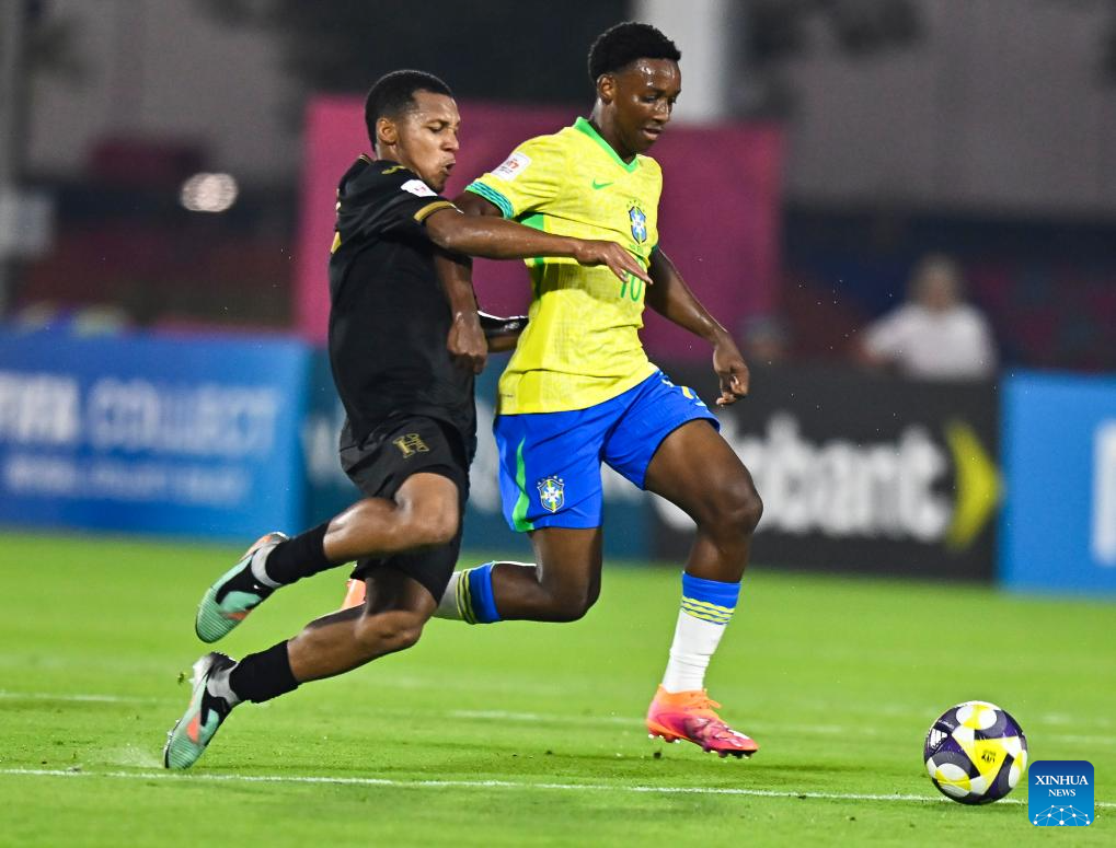Luis Eduardo (L) of Brazil vies with David Flores of Honduras during the group H match between Brazil and Honduras of FIFA U17 World cup Qatar 2025 in Doha, Qatar, on Nov. 4, 2025. (Photo by Nikku/Xinhua)
