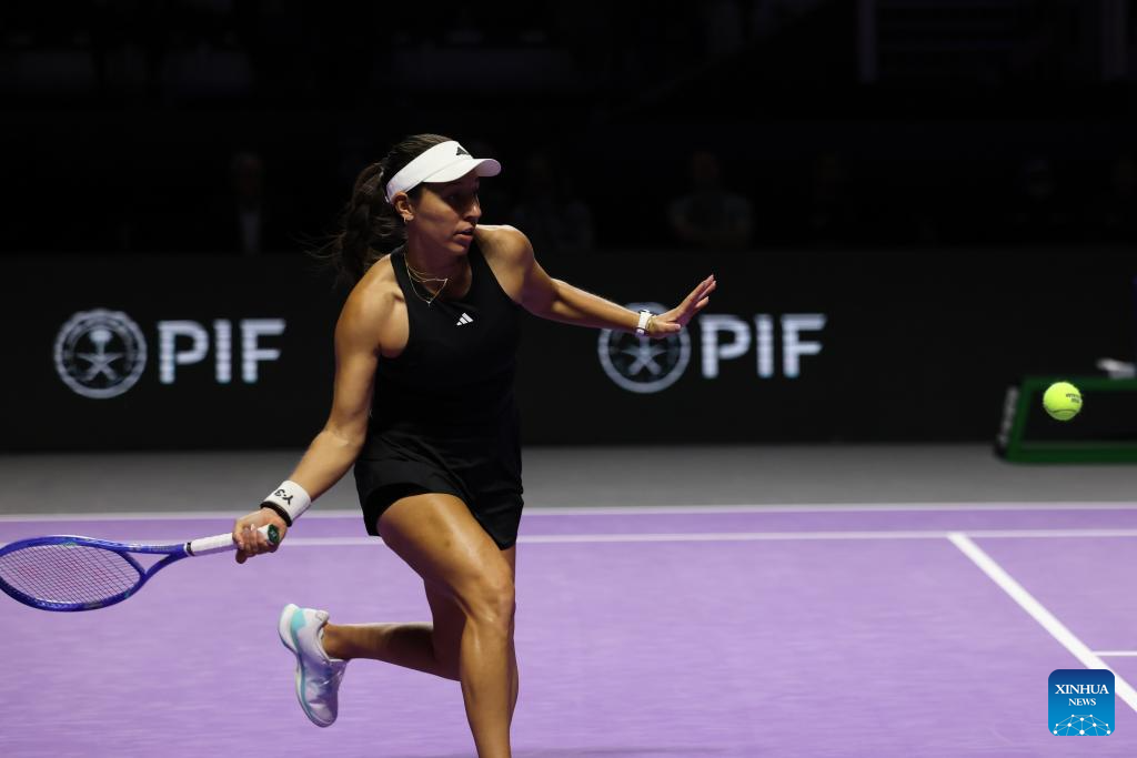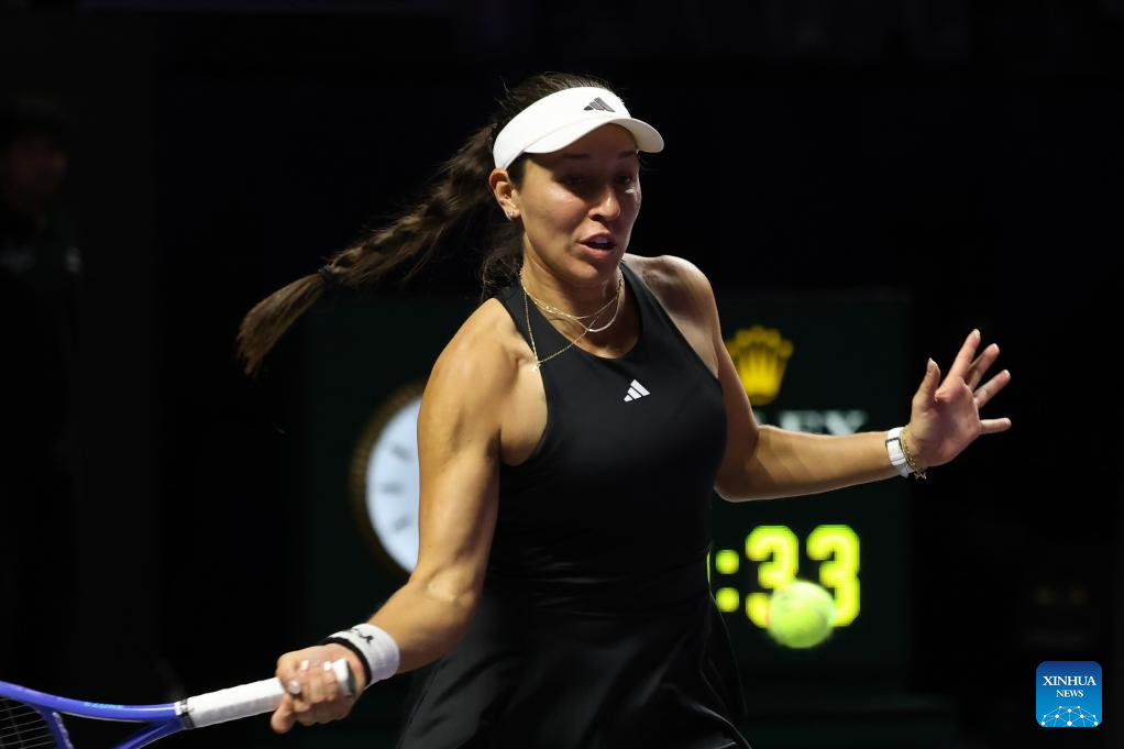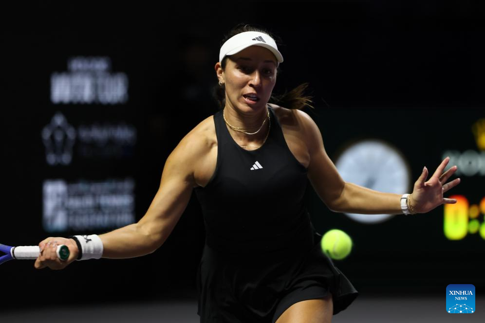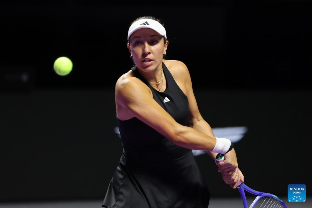 Jessica Pegula of the United States returns a ball during the round robin match against Aryna Sabalenka of Belarus at WTA Finals tennis tournament in Riyadh, Saudi Arabia, on Nov. 4, 2025. (Xinhua/Luo Chen)