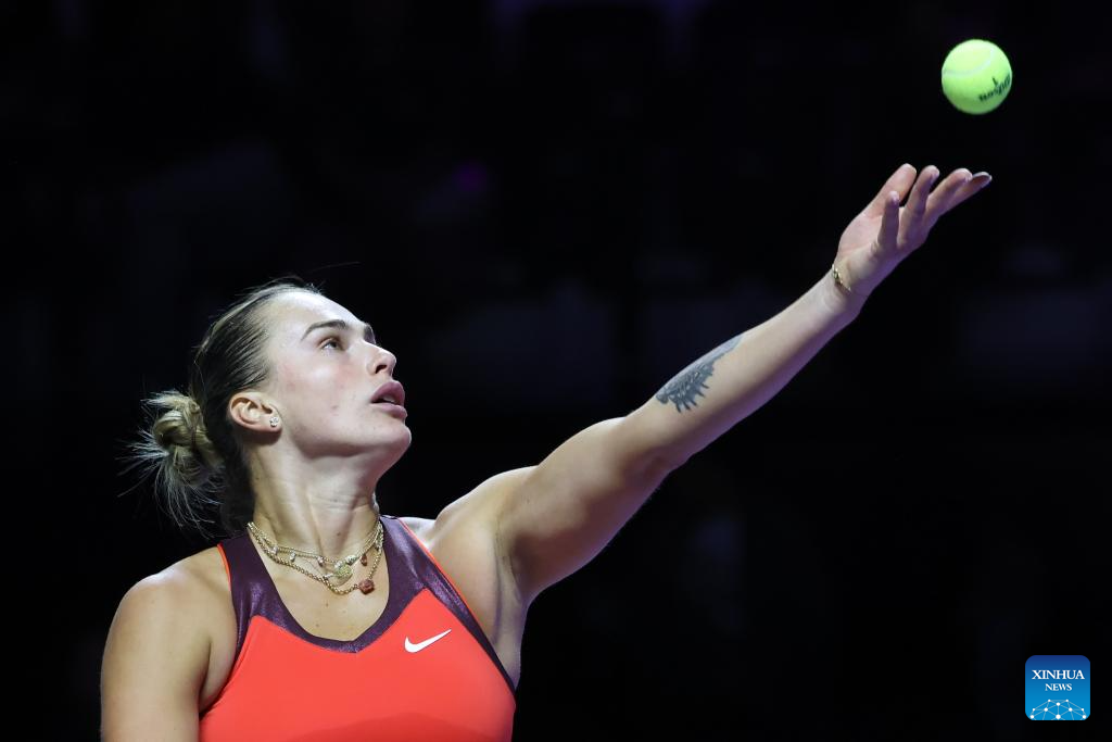 Aryna Sabalenka of Belarus serves during the round robin match against Jessica Pegula of the United States at WTA Finals tennis tournament in Riyadh, Saudi Arabia, on Nov. 4, 2025. (Xinhua/Luo Chen)