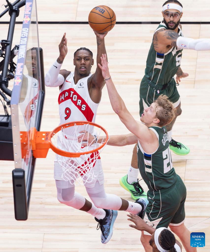 RJ Barrett (L) of Toronto Raptors goes for a layup during the 2025-2026 NBA regular season match between Toronto Raptors and Milwaukee Bucks in Toronto, Canada, on Nov. 4, 2025. (Photo by Zou Zheng/Xinhua)