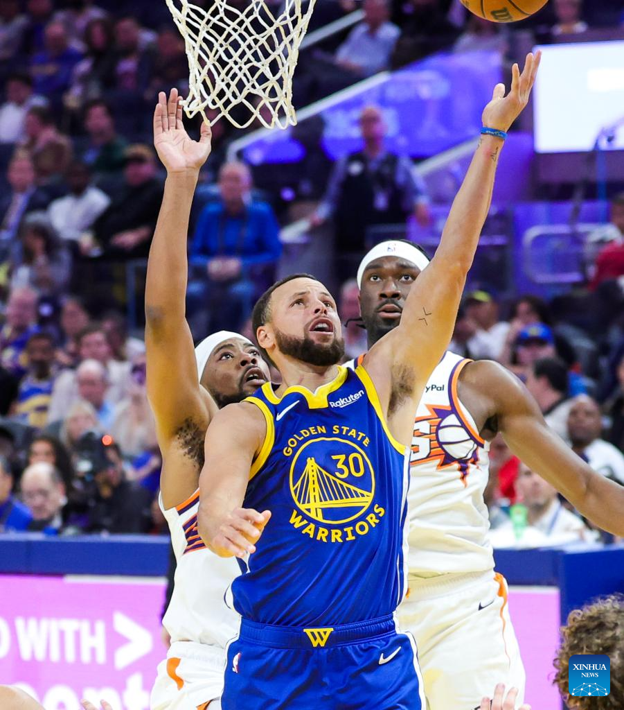Stephen Curry of Golden State Warriors competes during the 2025-2026 NBA regular season match between Phoenix Suns and Golden State Warriors in San Francisco, the United States, on Nov. 4, 2025. (Photo by Dong Xudong/Xinhua)