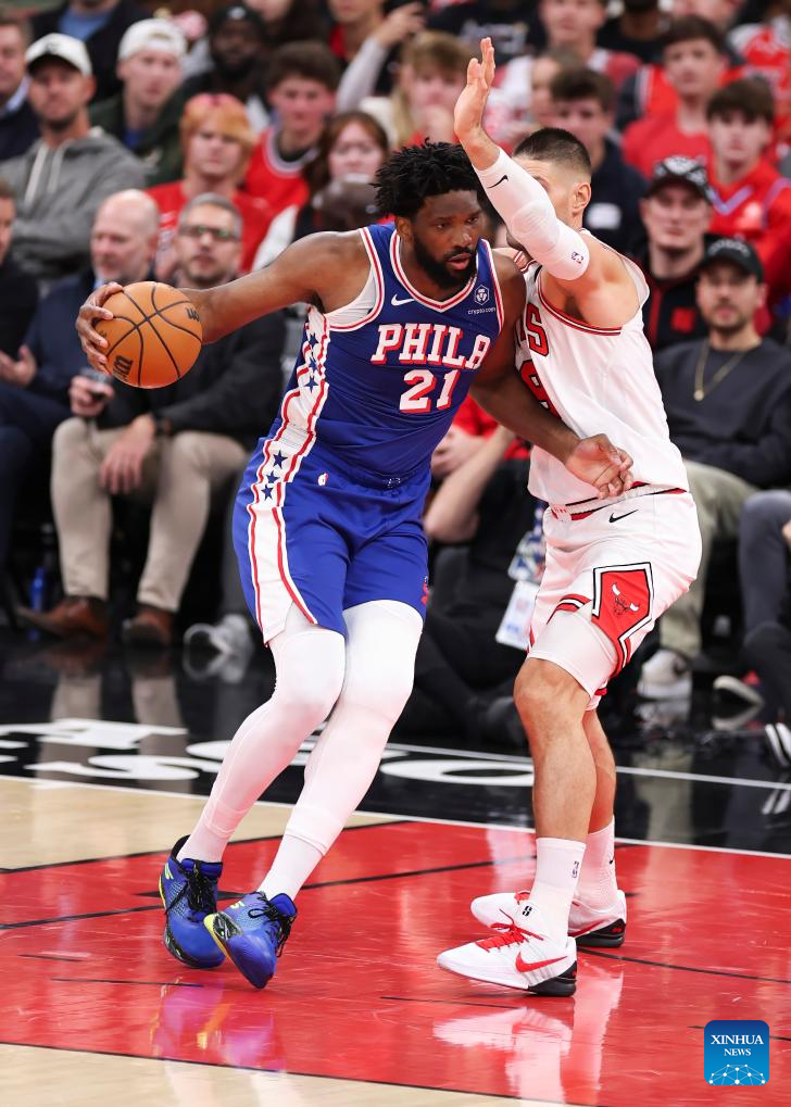 Philadelphia 76ers' Joel Embiid (L) makes a move on Chicago Bulls' Nikola Vucevic during the 2025-2026 NBA regular season match between Chicago Bulls and Philadelphia 76ers in Chicago, the United States, on Nov. 4, 2025. (Photo by Joel Lerner/Xinhua)