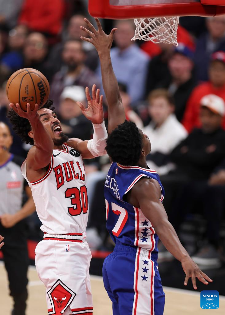 Philadelphia 76ers' Quentin Grimes (R) drives to the basket during the 2025-2026 NBA regular season match between Chicago Bulls and Philadelphia 76ers in Chicago, the United States, on Nov. 4, 2025. (Photo by Joel Lerner/Xinhua)