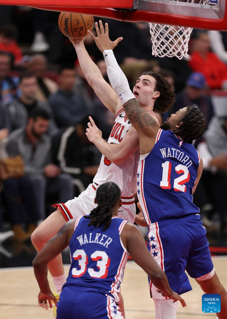 Chicago Bulls' Josh Giddey (back) goes to the basket during the 2025-2026 NBA regular season match between Chicago Bulls and Philadelphia 76ers in Chicago, the United States, on Nov. 4, 2025. (Photo by Joel Lerner/Xinhua)