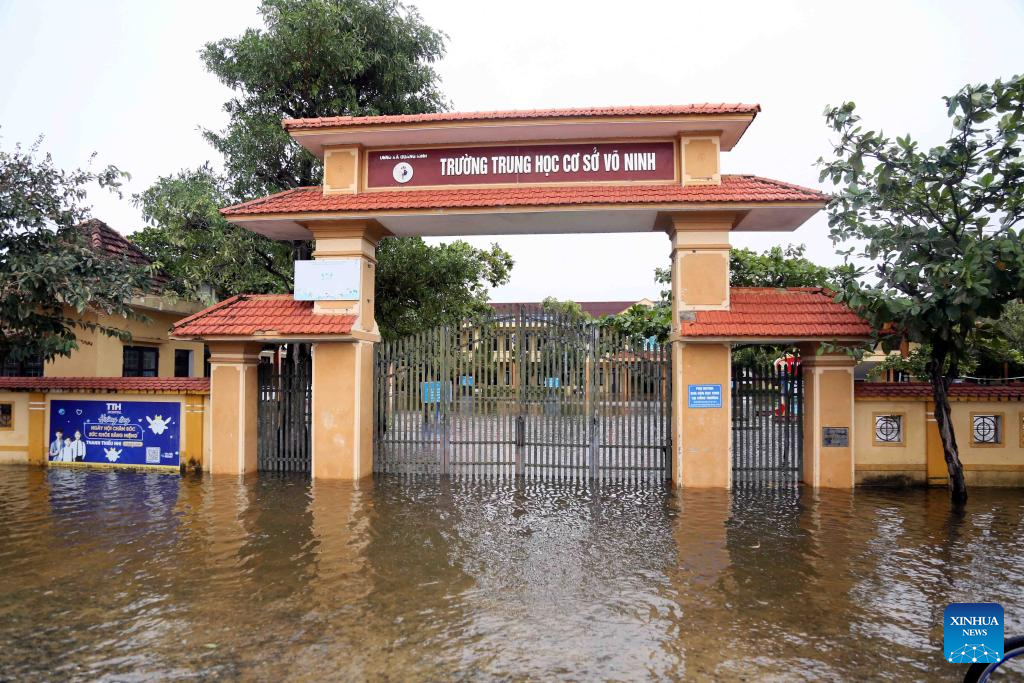 This photo taken on Nov. 4, 2025 shows the main gate of a middle school submerged in floodwater in Quang Tri Province, Vietnam. The death toll from heavy rains and flooding in Vietnam's central region has risen to 47, with eight people missing and 130 others injured, the Vietnam Disaster and Dyke Management Authority reported Wednesday. (VNA/Handout via Xinhua)