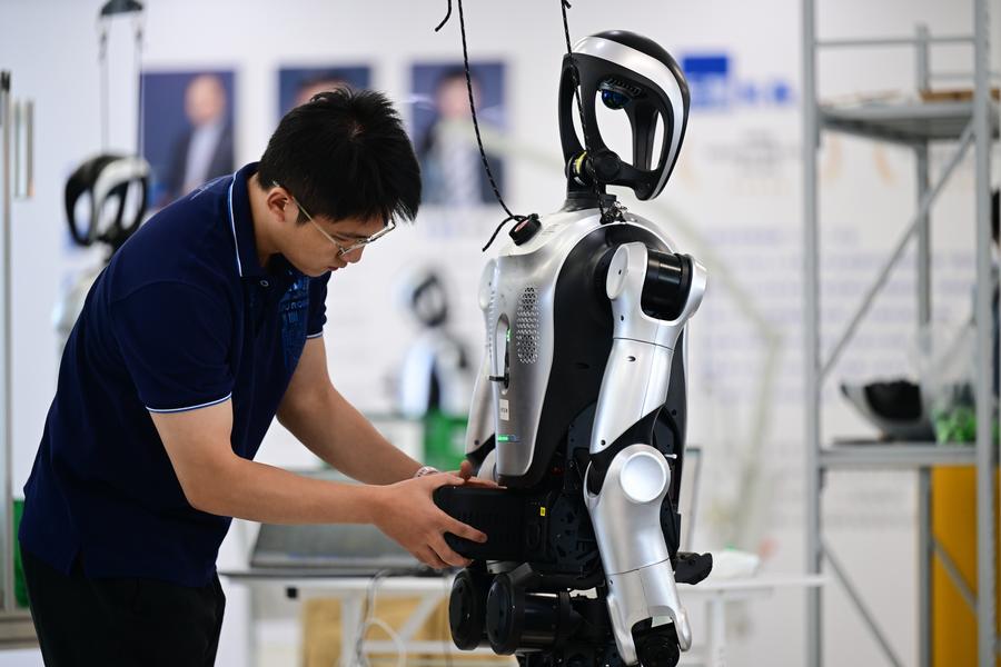 An engineer adjusts a humanoid robot at a laboratory of Leju Robotics in Hefei, east China's Anhui Province, Oct. 24, 2025. (Xinhua/Zhou Mu)