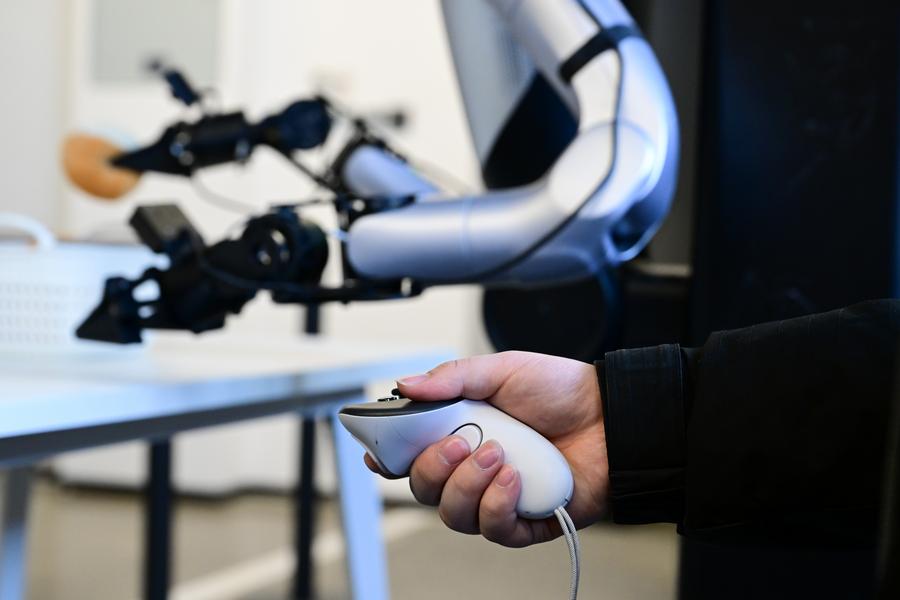 A staff member trains a humanoid robot to fetch objects for data collection purpose at Zerith, a robotics company, in Hefei, east China's Anhui Province, Nov. 25, 2025. (Xinhua/Zhou Mu)