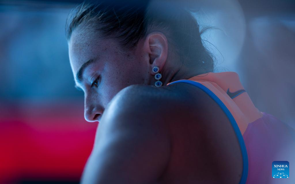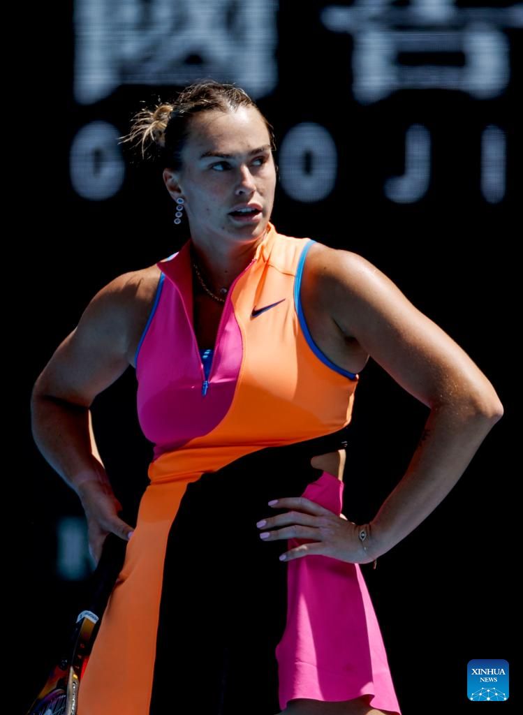 Aryna Sabalenka of Belarus reacts during the women's singles 2nd round match against Bai Zhuoxuan of China at the Australian Open tennis tournament in Melbourne, Australia, Jan. 21, 2026. (Xinhua/Ma Ping)