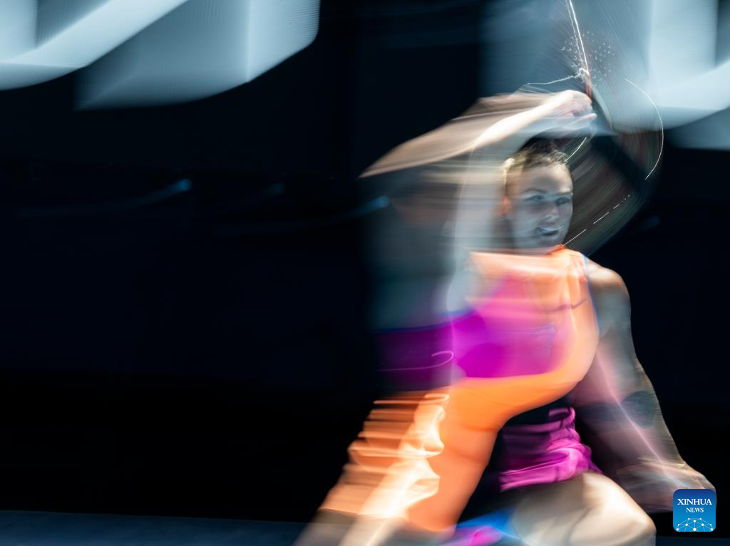 Bai Zhuoxuan of China hits a return during the women's singles 2nd round match against Aryna Sabalenka of Belarus at the Australian Open tennis tournament in Melbourne, Australia, Jan. 21, 2026. (Xinhua/Ma Ping)