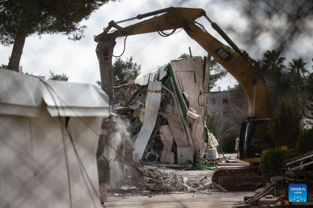 Israeli authorities demolish a building within the East Jerusalem compound of the United Nations Relief and Works Agency for Palestine Refugees (UNRWA), Jan. 20, 2026. Israeli authorities on Tuesday demolished several buildings within the East Jerusalem compound of the UNRWA, an action that drew immediate and sharp condemnation from the UN body.