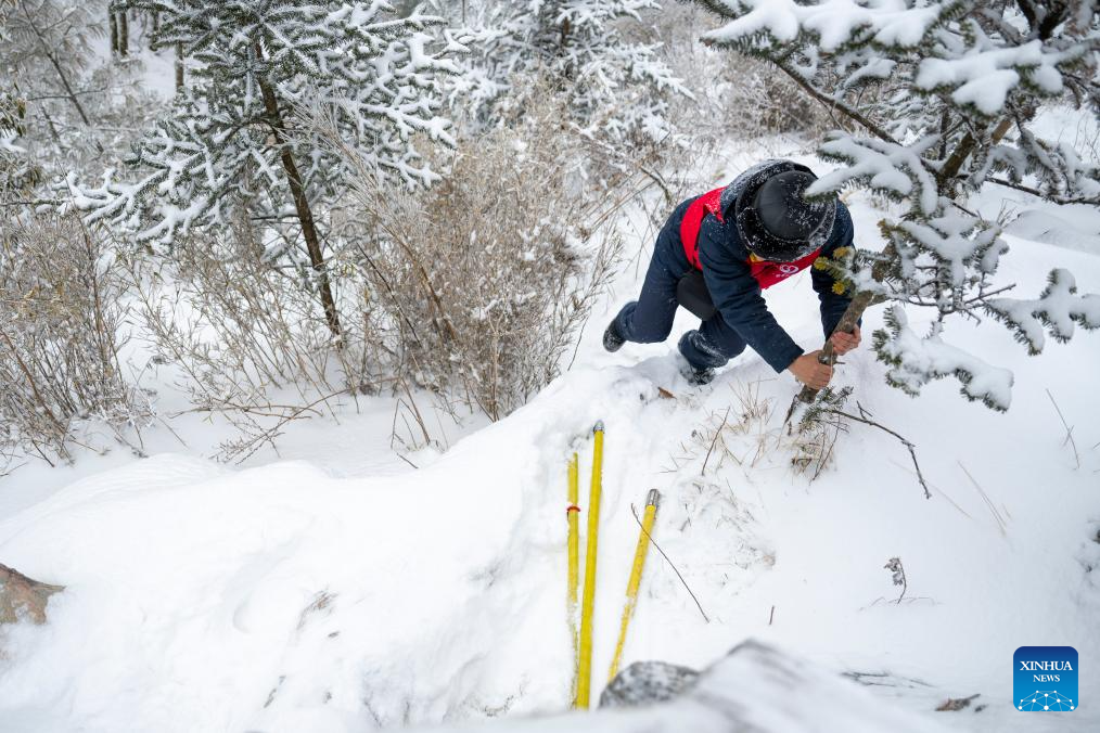 A worker patrols for power supply problems in Muyu Town, Shennongjia Forestry District of central China's Hubei Province, Jan. 21, 2026. Facing widespread low-temperature with severe icing on power lines in some high-altitude areas in Hubei Province, power maintenance staff conducted patrols to ensure the stable operation of the power grid. (Xinhua/Wu Zhizun)